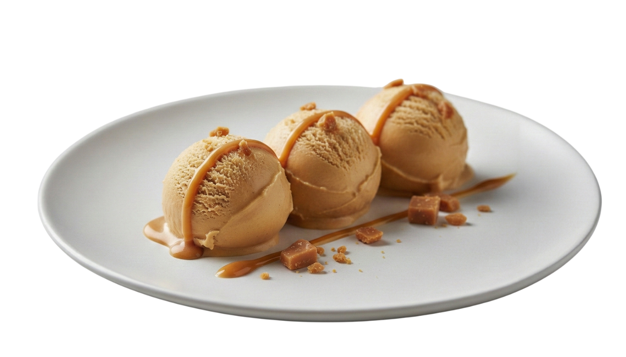 Smooth caramel ice cream dripping with golden temptation.