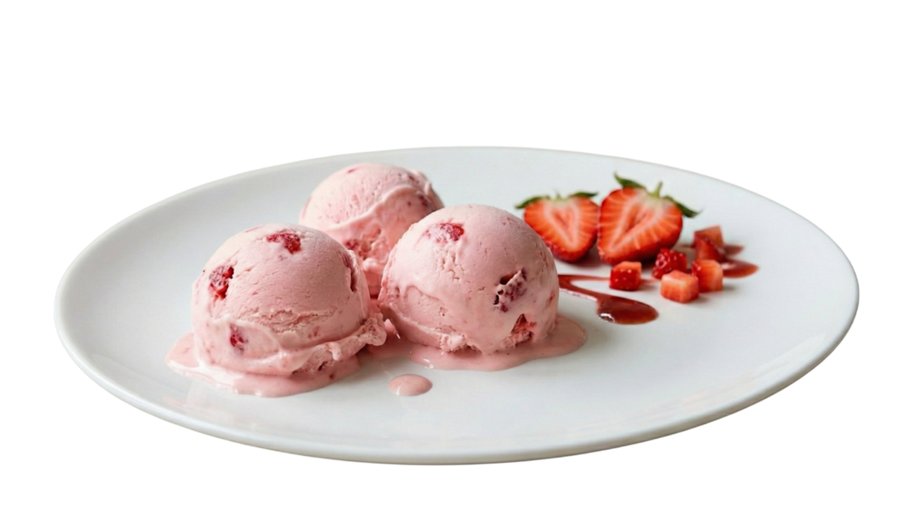 Juicy strawberry scoops topped with a swirl of sweet delight.